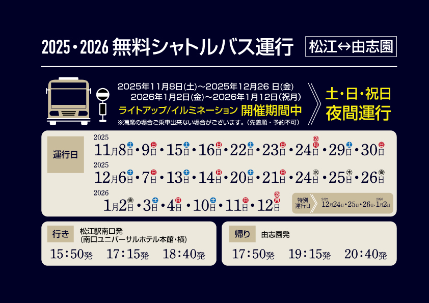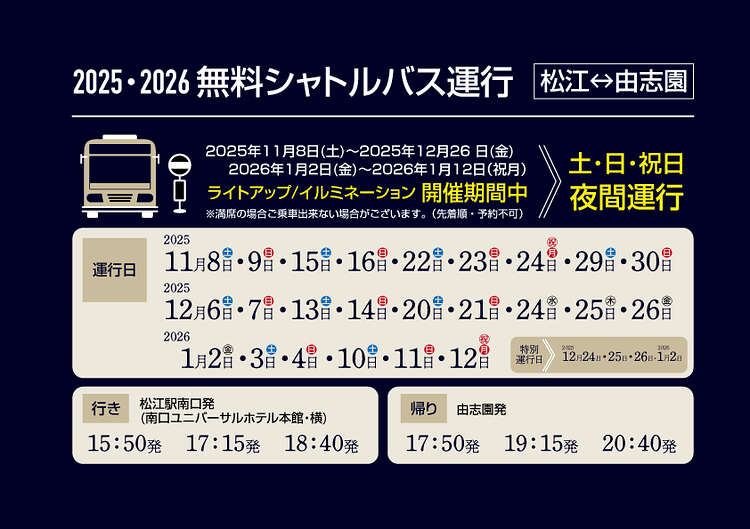 夜間ライトアップ開催期間中 無料シャトルバス運行スケジュールのご案内