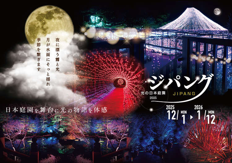 日本庭園を舞台に和のイルミネーションが繰り広げられる「光の日本庭園 ジパング〜JIPANG〜」を開催します。最新テクノロジーを取り入れたイルミネーションで園内を彩り、新たな光の世界を体感いただけます。プロジェクターによる庭園プロジェクションマッピングやピクセルイルミネーション、光り輝く出雲富士イルミネーションや光の世界に没入できる七色トンネル・光の小径など新しいエリアも盛り沢山、園内中央の池泉を舞台にした水中イルミネーションも見所です。