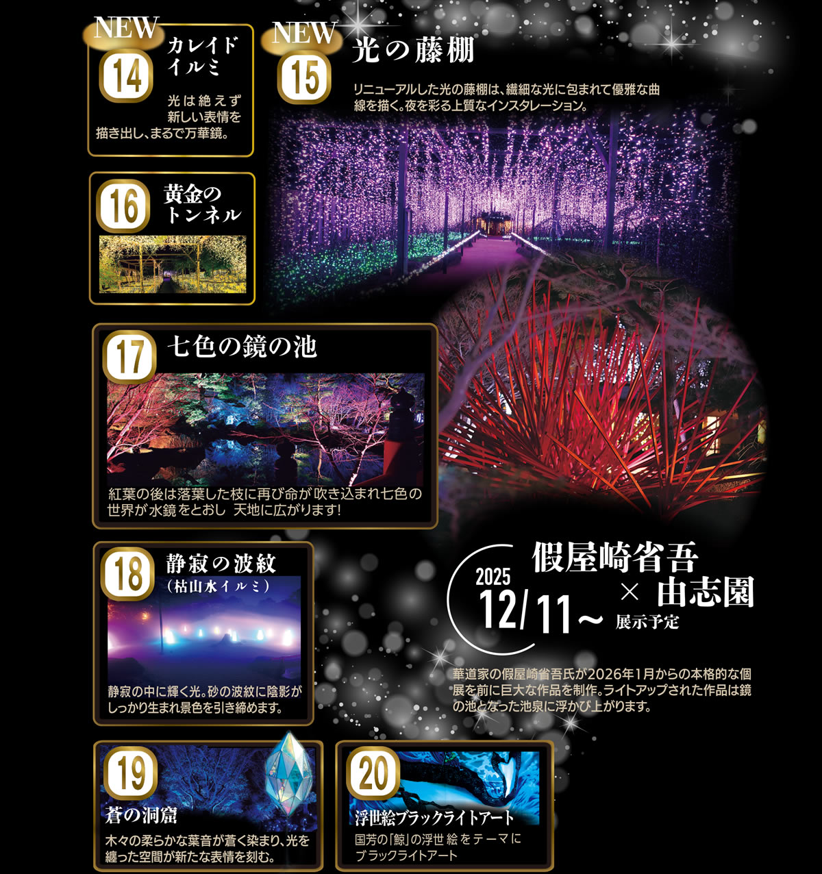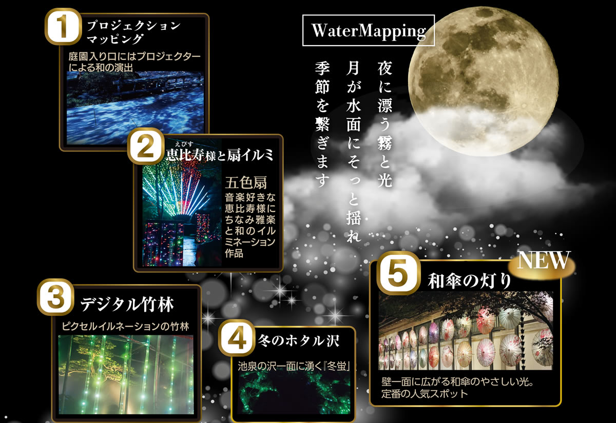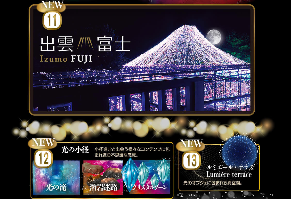 プロジェクターによる庭園プロジェクションマッピングやピクセルイルミネーション、光り輝く出雲富士イルミネーションや光の世界に没入できる七色トンネル・光の小径など新しいエリアも盛り沢山、園内中央の池泉を舞台にした水中イルミネーションも見所です。