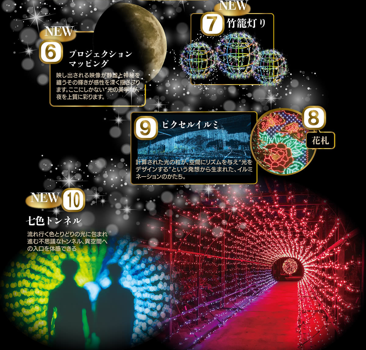 最新テクノロジーを取り入れたイルミネーションで園内を彩り、新たな光の世界を体感いただけます。