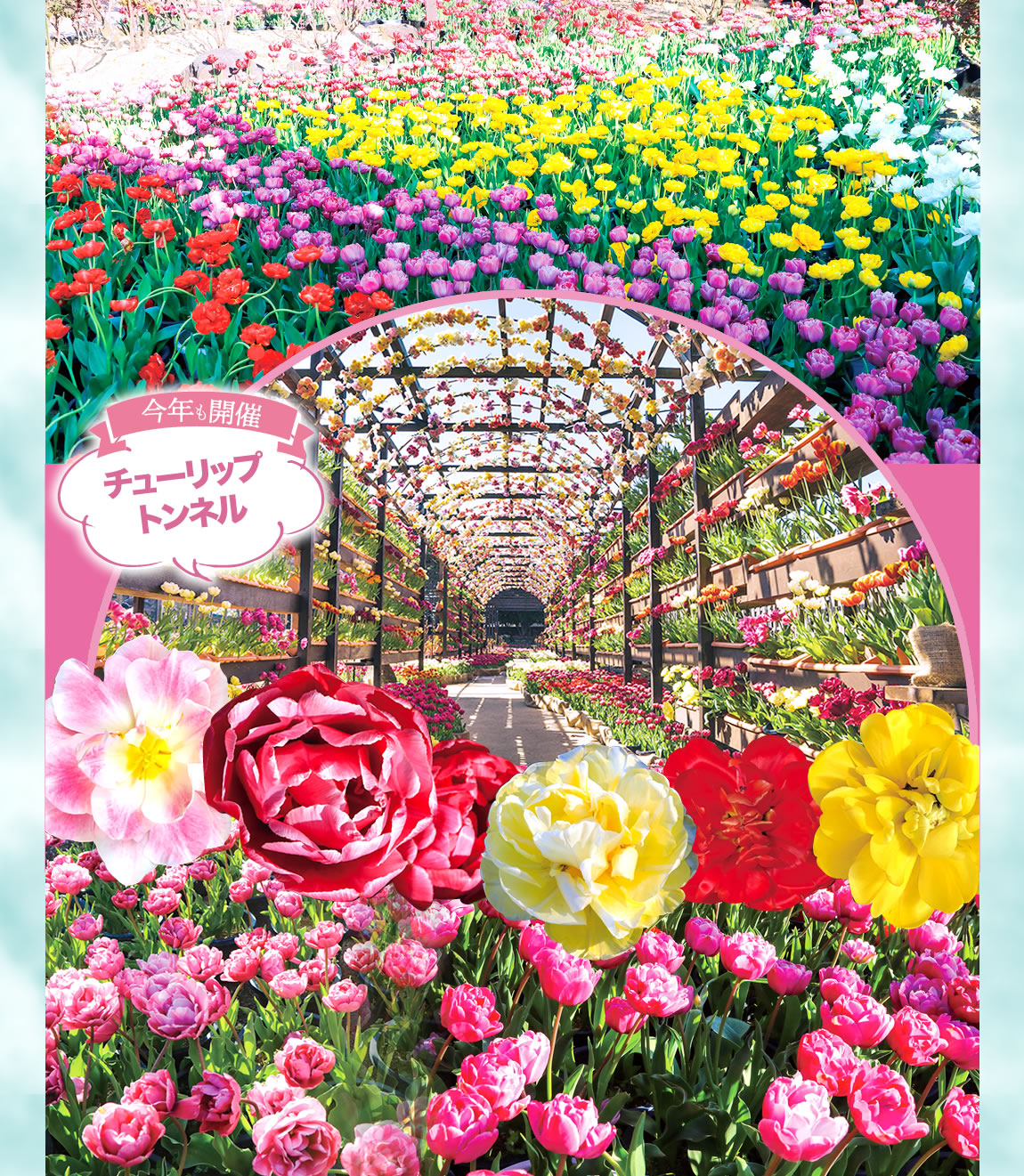 毎年好評いただいております牡丹咲チューリップのトンネルも公開します。